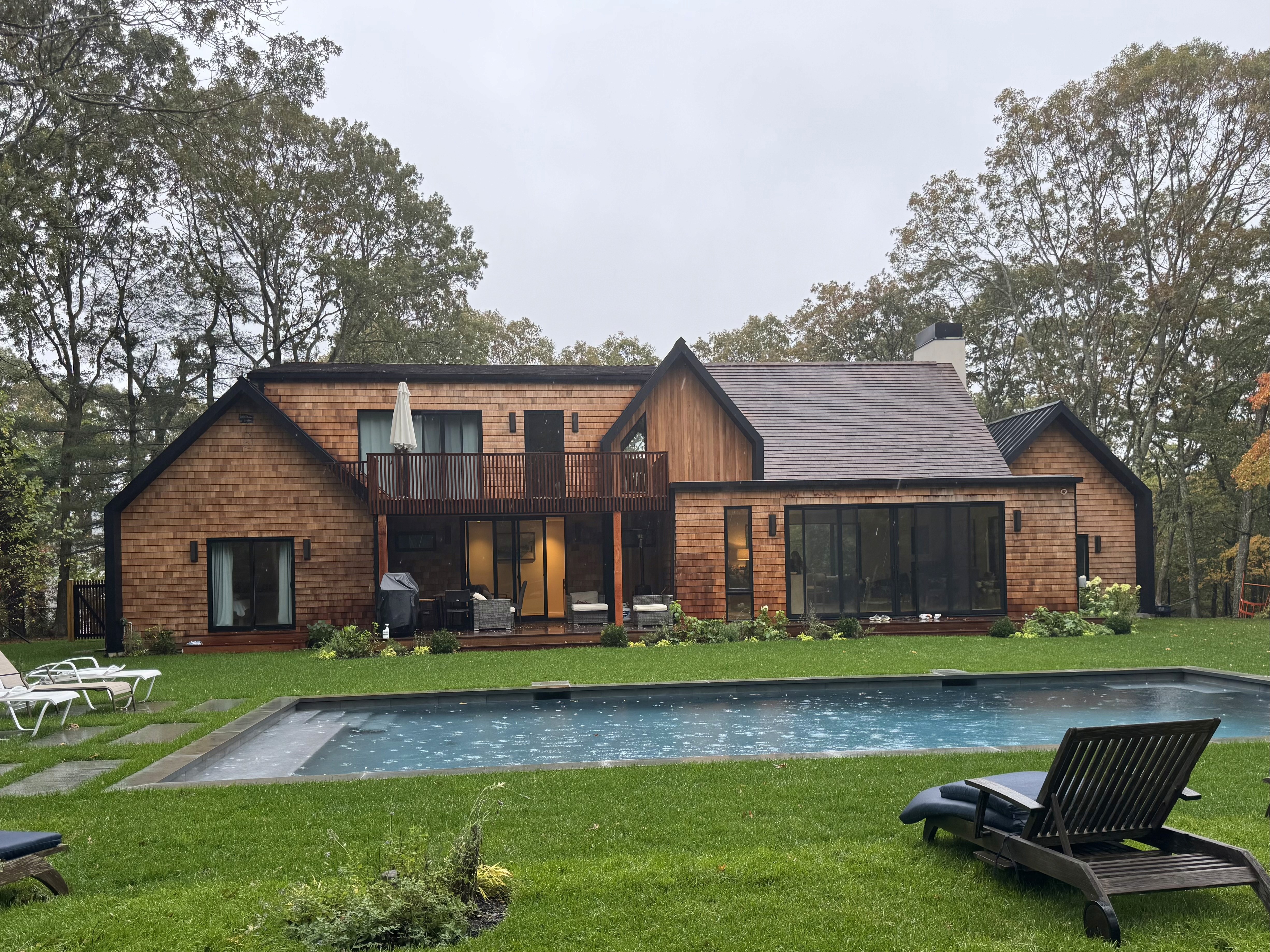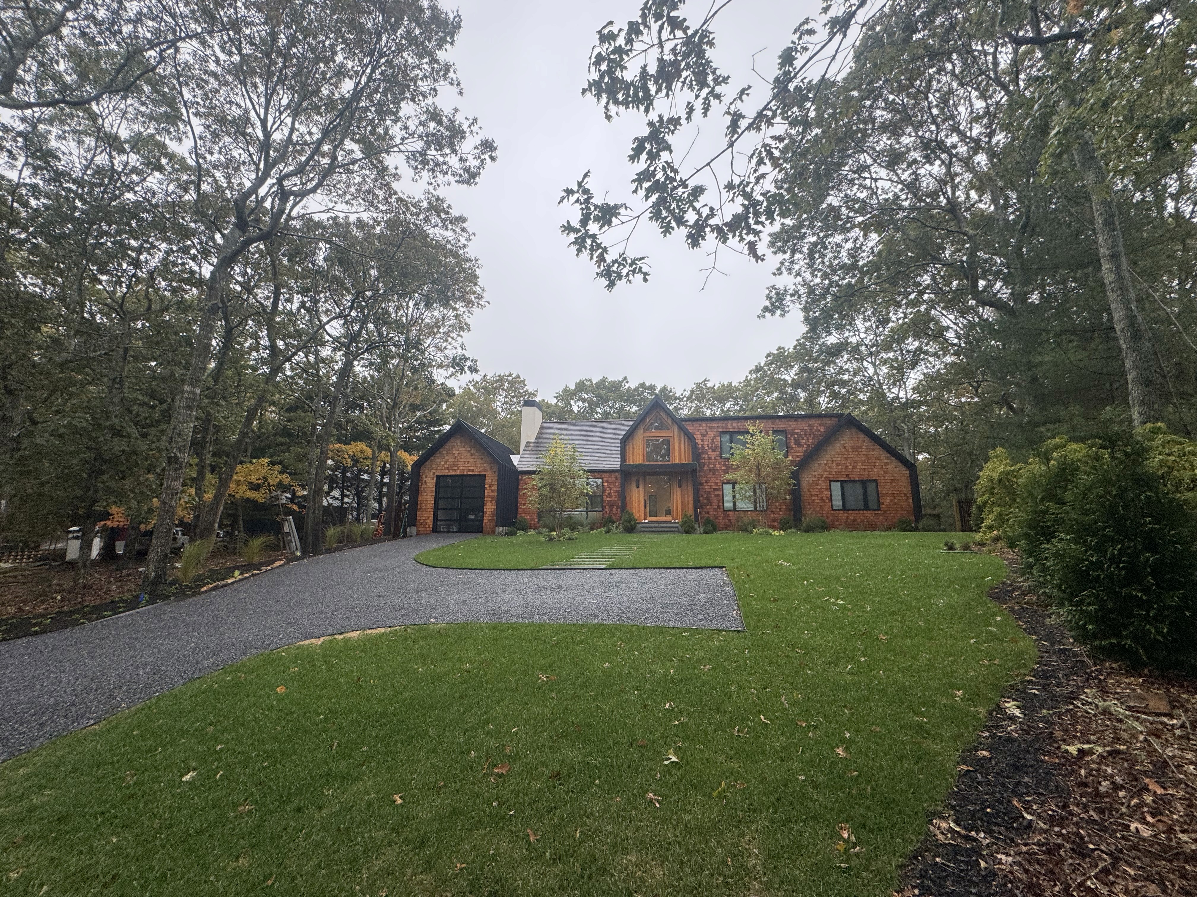 Construction focused on blending traditional craftsmanship with modern detailing. The structure began with a strong foundation and framing to support the expansive layout and steep gables. Exterior finishes include cedar shingles for warmth, complemented by dark vertical siding and a sleek metal roof for durability. Inside, mechanical systems were integrated before custom millwork and high-end finishes brought the interiors to life. Landscaping and hardscaping completed the design, creating a seamless connection between architecture and nature.